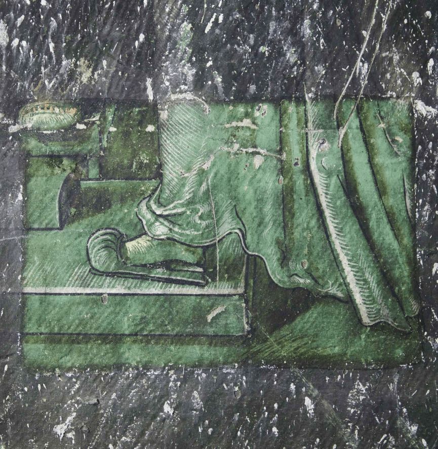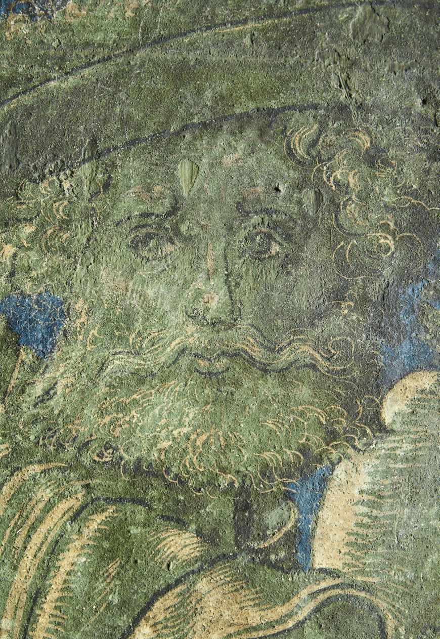 Découverte derrière les lambris posés en 1775, la peinture murale se trouvait dans un état de conservation remarquable. La peinture où domine le vert (à base de cuivre), présente d’étonnants fonds bleus (azurite) et de fins modelés obtenus au moyen de hachures (blanc et jaune de plomb). Les éléments rehaussés à la feuille d’or signalent la volonté de donner une touche prestigieuse à cet ensemble